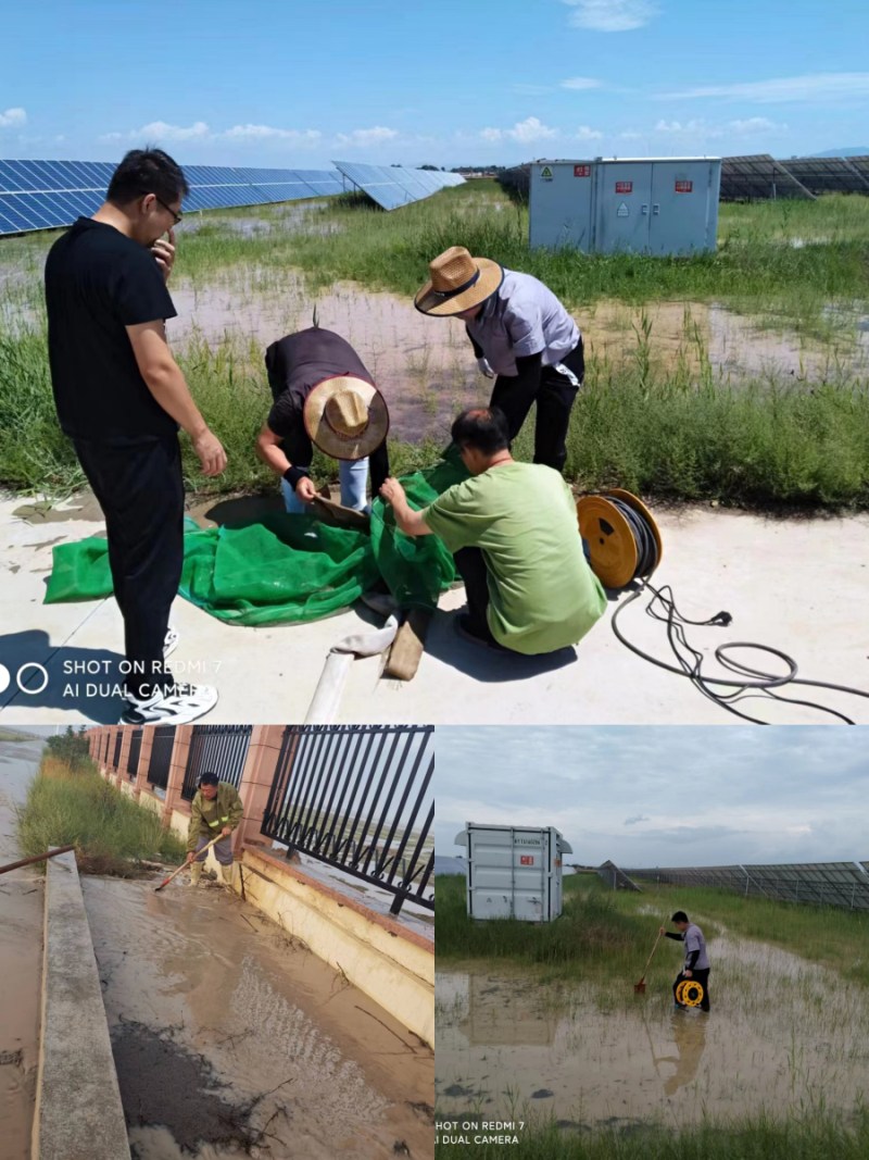 8月7日凌晨,沙爾沁鎮突降暴雨,雨勢急、雨量大,光伏電站泄洪渠水位迅速上漲,防汛壓力劇增。值班人員立即通知公司主要領(lǐng)導匯報汛情后,當即啟動(dòng)防汛應急預案,應急搶險人員分組行動(dòng),清淤組負責泄洪渠內漂浮物及樹(shù)枝等雜物的清理工作確保泄洪渠暢通;巡視組負責廠(chǎng)區巡視觀(guān)察,及時(shí)發(fā)現危及設備的險情;設備組負責安裝排水設備,不間斷抽排,確保第一時(shí)間發(fā)現、第一時(shí)間處理。