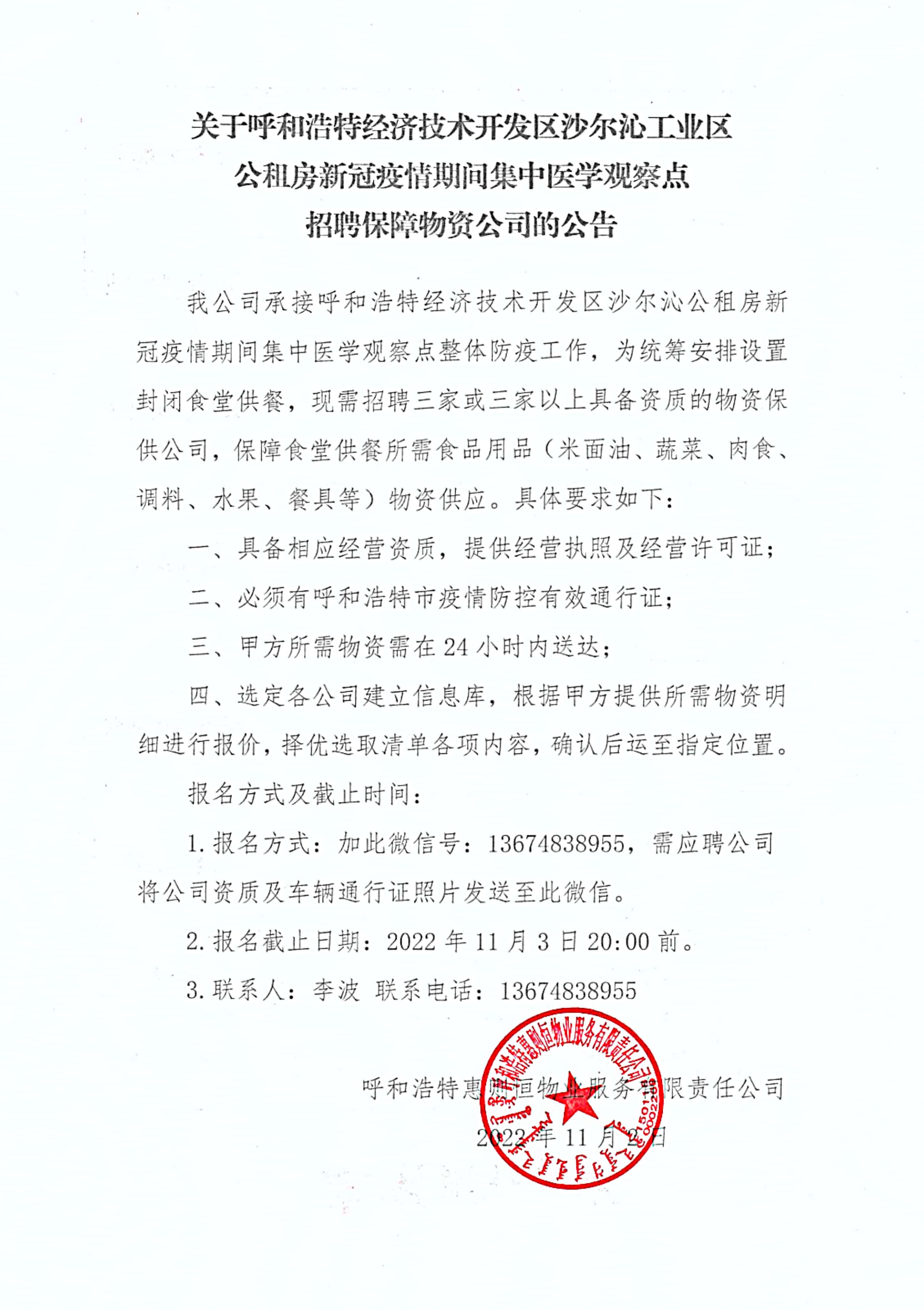 關(guān)于呼和浩特經(jīng)濟技術(shù)開(kāi)發(fā)區沙爾沁工業(yè)區公租房新冠疫情期間集中醫學(xué)觀(guān)察點(diǎn)招聘保障物資公司的公告