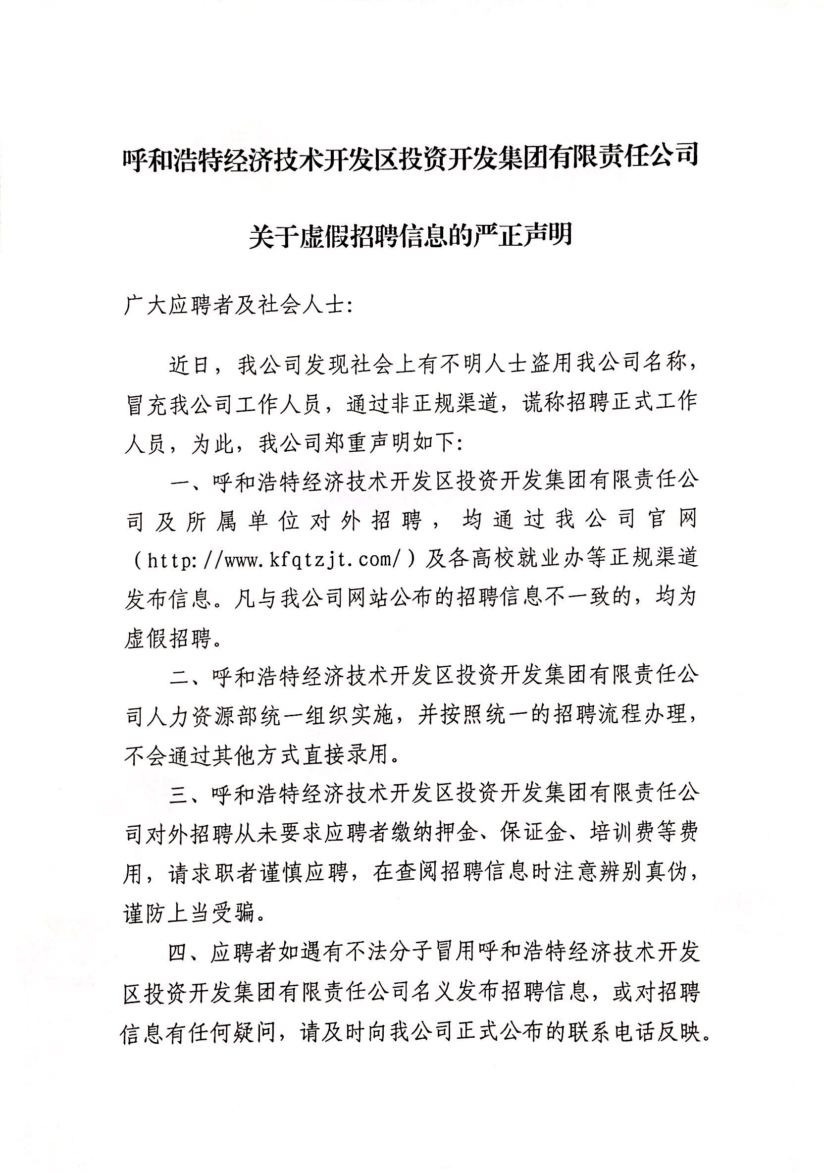 開(kāi)發(fā)區投資公司關(guān)于虛假招聘信息的嚴正聲明 發(fā)布時(shí)間:2019-05-22 | 瀏覽次數:32526 次